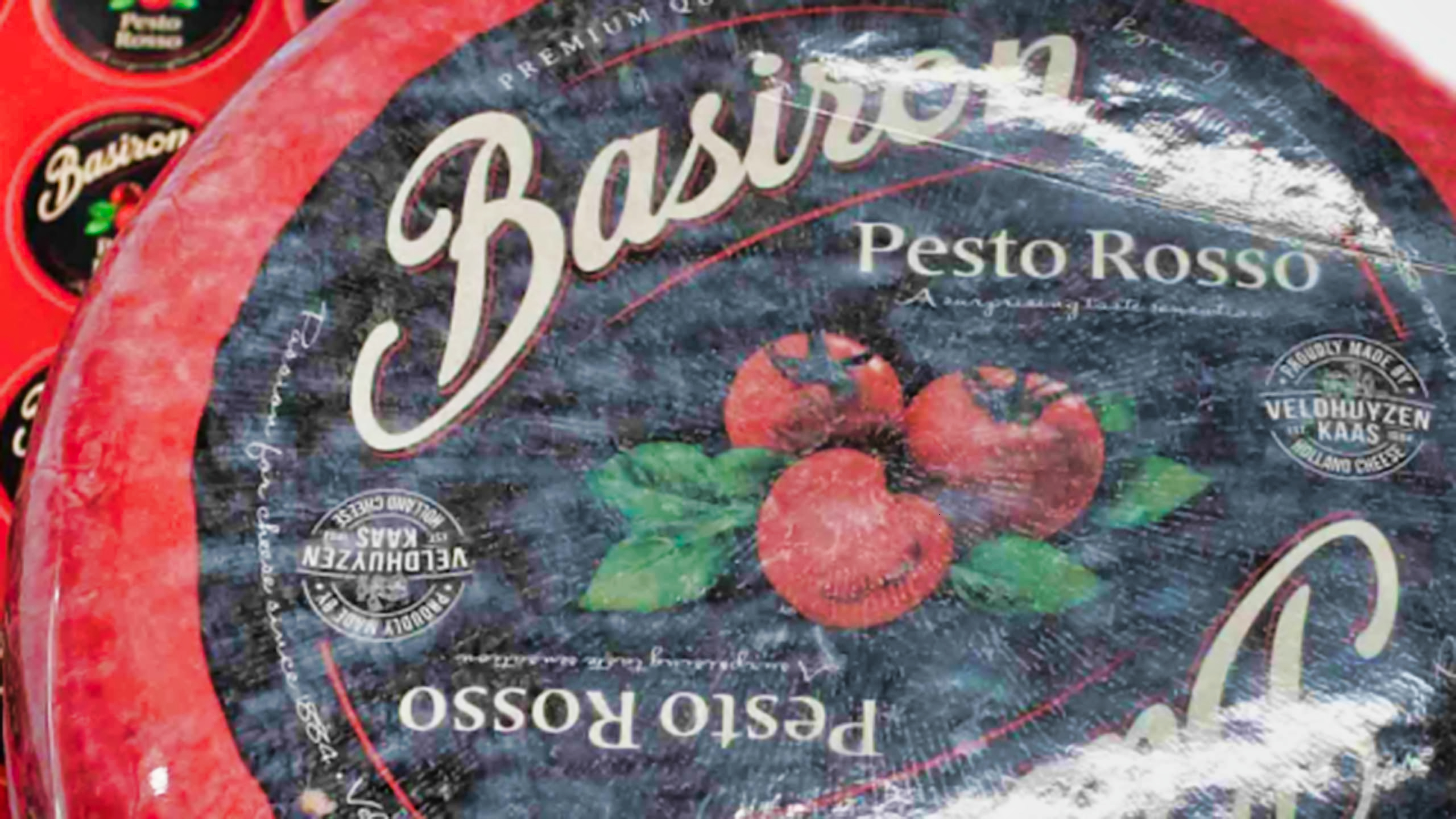 Deliciosa mezcla de queso gouda con pesto rojo. Ideal para buffet de quesos. Aporta color y sabor.
